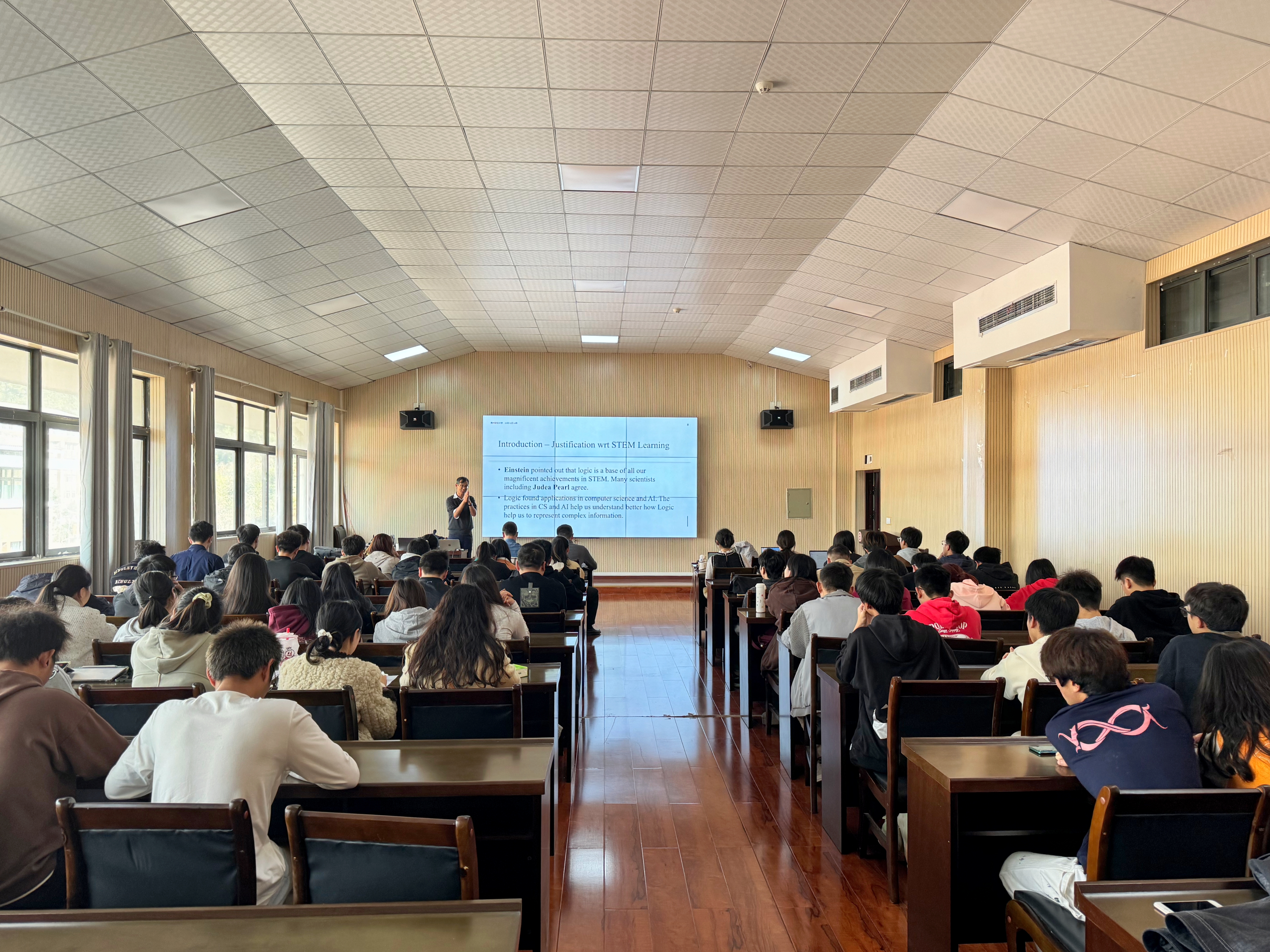 张元林博士的讲座题目是“自然语言,计算机科学,人工智能,数学和教育”。当今,人工智能正在对各行各业产生巨大而深远的颠覆式影响,大量的传统职业也许将不复存在,新兴的职业会应运而生。这使我们不得不重新思考:应该如何教育我们未来的一代?在这之中,有趣的是,人工智能本身就为我们提供了一些思路和方法。目前人工智能有两个大的方向:一个方向以大语言模型为代表,另一个是基于逻辑的方向,它们各有所长,目前还没有一个人工智能的理论或系统能够使两者完美结合。然而,人脑却天生具备两者的能力。理工科教育的一个共识是它的各个科目是紧密联系的,在中小学甚至是大学教育中应该有机地整合各相关学科的教与学,但具体教什么怎么教一直是理工教育研究的一个核心问题基于逻辑的人工智能提供了一个答案:逻辑以及计算机科学的方法提供了一个自然、简洁、清晰地整合各个学科学习的理论。基于这个理论,再辅以基于大语言模型的人工智能技术,人们可以开发出有效帮助员工学习理工科目的智能系统。张元林博士是从“智能的窗口—自然语言”谈起,然后到计算机科学、人工智能和数学,张博士还用一些其它数理学科的概念来演示逻辑是怎样统一这些概念的。