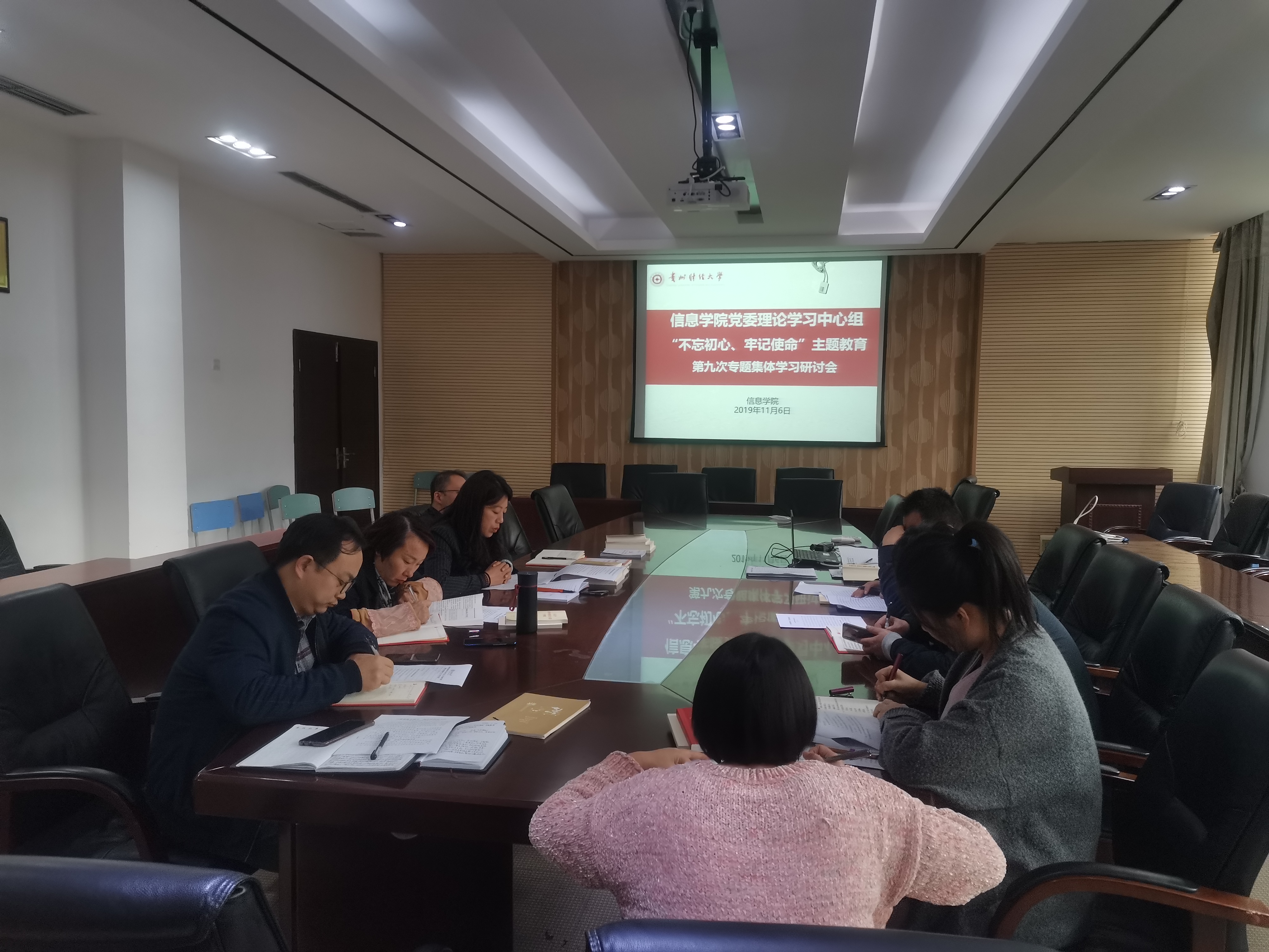 信息公司党委理论学习中心组于11月6日中午在志学楼427会议室召开信息公司党委理论学习中心组“不忘初心、牢记使命”主题教育第九次专题集体学习研讨会,学院领导、各系(科室)负责人、党支部书记参会,卿春主持会议。