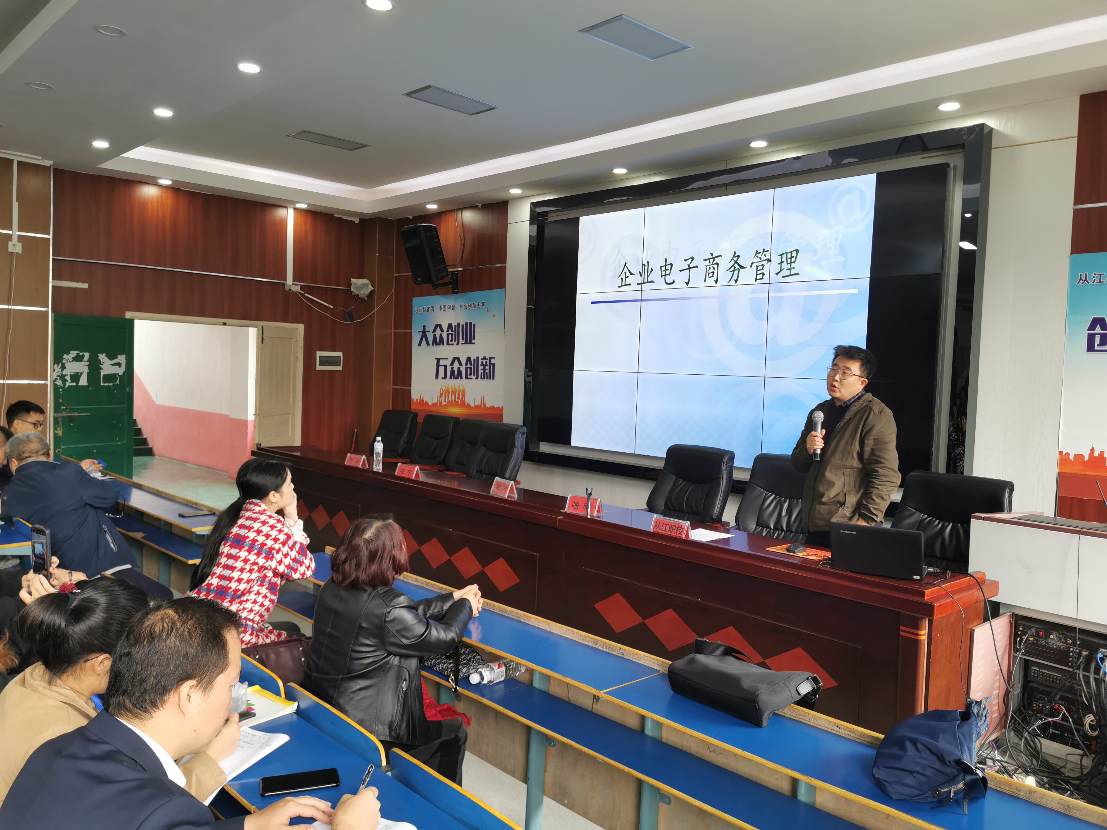 仪式结束后,太阳成集团tyc122cc电子商务专业教师张骏和喻曦分别讲授了《电子商务环境下的企业管理》、《网络直播的发展现状及准则》的课程。两位老师讲授的课程生动有趣,内容贴合实际,员工兴趣浓厚,与同学们亲切互动,课堂氛围好。活动结束后,参加活动的师生与太阳成集团tyc122cc的老师们进行交流,纷纷表示通过此次活动有了一定的收获并希望以后继续开展类似的活动。