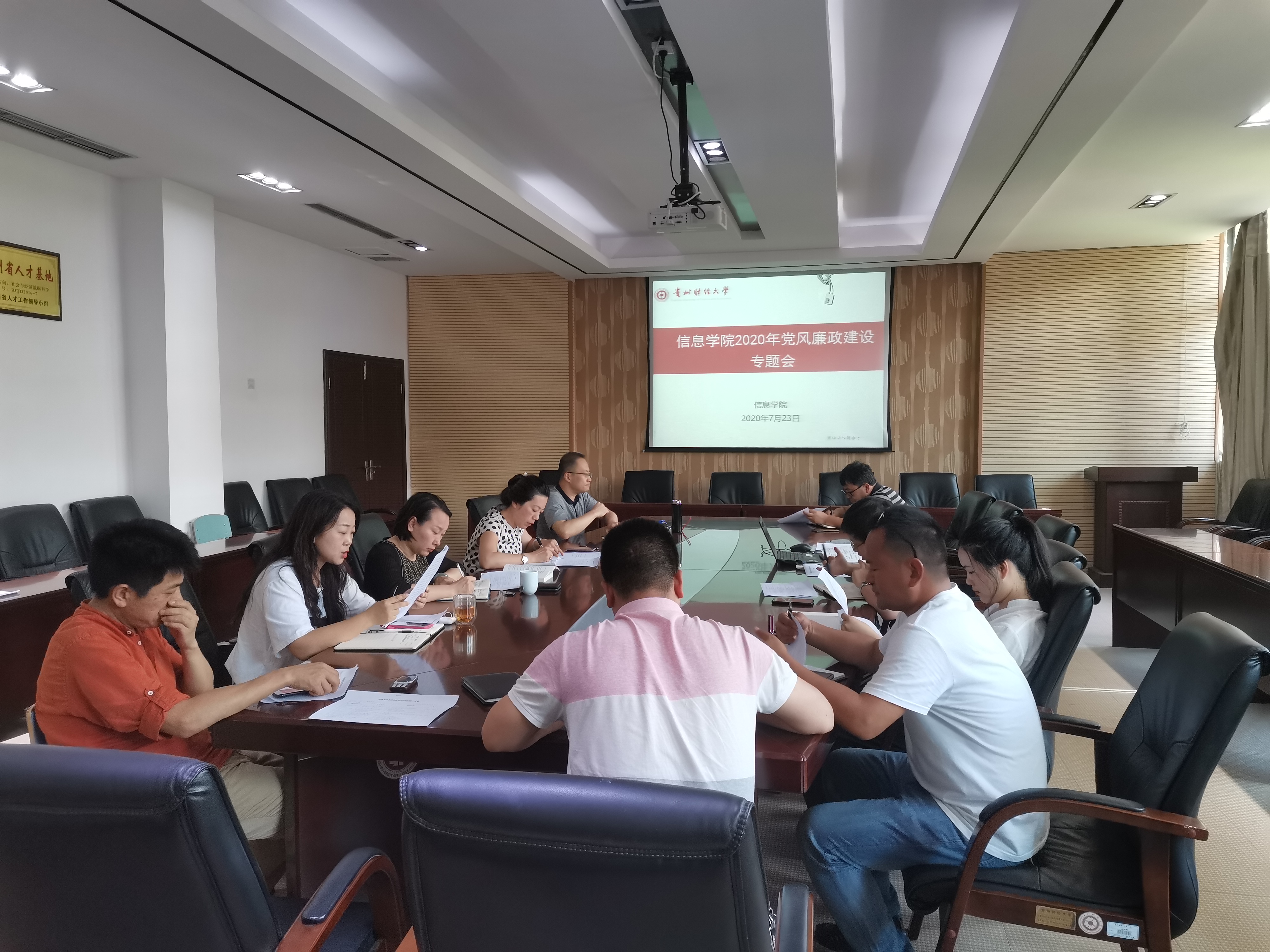 公司党委副书记何瑞传达了学校2020年全面从严治党工作会议精神,副经理陈琴领学《中国共产党廉洁自律准则》。与会人员分析、讨论了学院廉政风险点及防控措施,学院班子成员就所分管领域的党风廉政建设情况进行了汇报。
