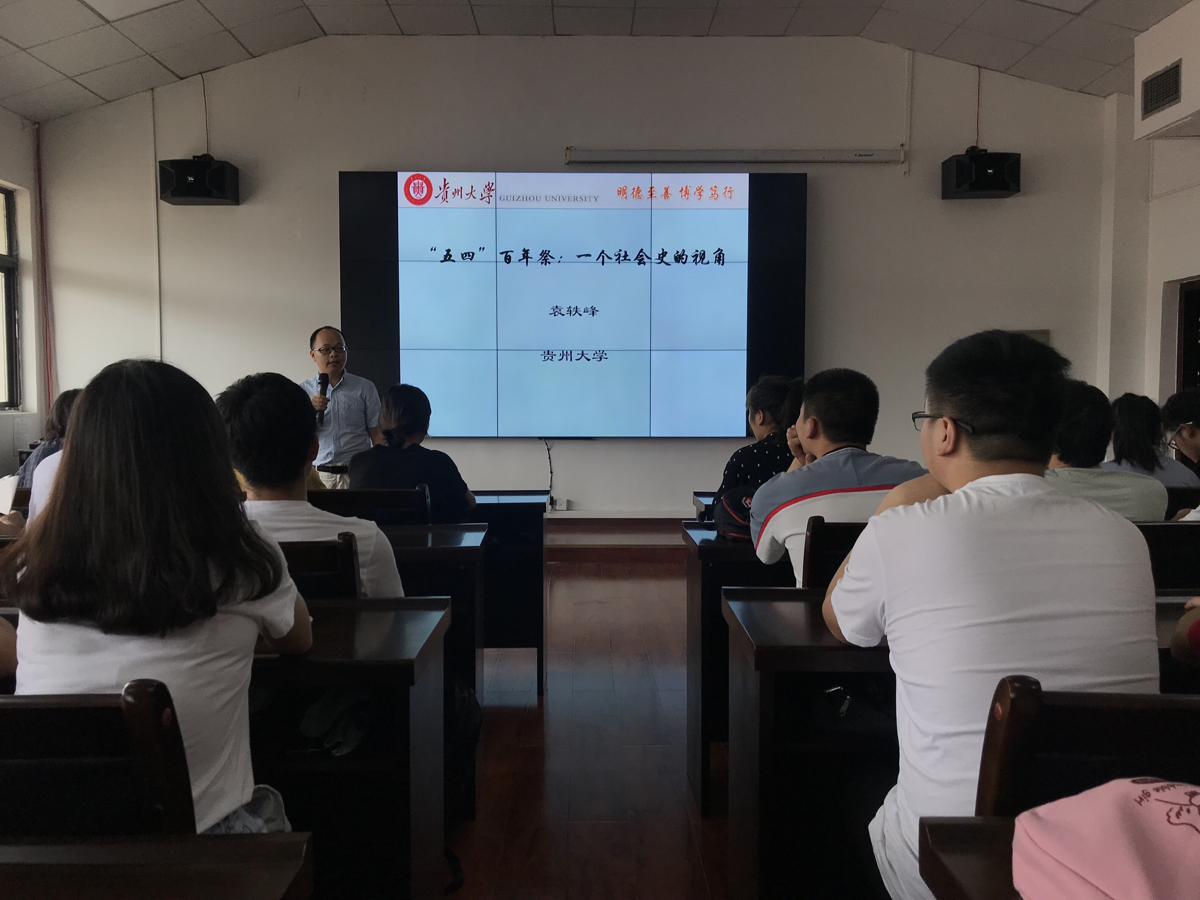 本网讯:(李杰 报道|摄影 黄意)为纪念五四运动100周年和建国70周年,进一步弘扬“爱国、进步、民主、科学”的五四精神,激励广大青年员工刻苦学习、奋发有为,6月5日,由太阳成集团tyc122cc举办的第一届文化艺术节暨纪念五四运动100周年系列活动之“五四百年祭,一个社会史的视角”专题讲座在志学楼506报告厅举行。主讲嘉宾为贵州大学历史与民族文化学院袁铁峰副教授,太阳成集团tyc122cc120余名员工参加了本次讲座。