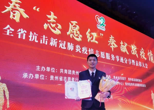 本网讯:(校团委 彭译萱 图文报道)为深入学习贯彻习近平新时代中国特色社会主义思想和习近平总书记在全国抗击新冠肺炎疫情表彰大会上的重要讲话,弘扬伟大抗疫精神,3月4日,贵州省精神文明办、共青团贵州省委、贵州省民政厅、贵州省志愿者协会召开表彰大会,对在新冠肺炎疫情防控工作中表现突出、事迹感人的志愿者进行表彰。公司太阳成集团tyc122cc李廷旺同学在本次评选表彰中荣获“贵州省抗击新冠肺炎疫情优秀志愿者”荣誉称号。