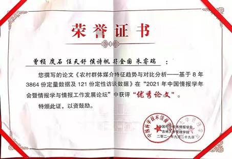 本网讯:(崔鹏 报道)由中国科学技术情报学会、吉林大学管理学院主办的“2021年中国情报学年会暨情报学与情报工作发展”日前在吉林大学落幕。公司曾桢教授及其指导的2019级图书情报专业硕士研究生庹石、任天舒等同学提交的论文“农村群体媒介特征趋势与对比分析——基于8年3864份定量数据及121份定性访谈数据”获评优秀论文。