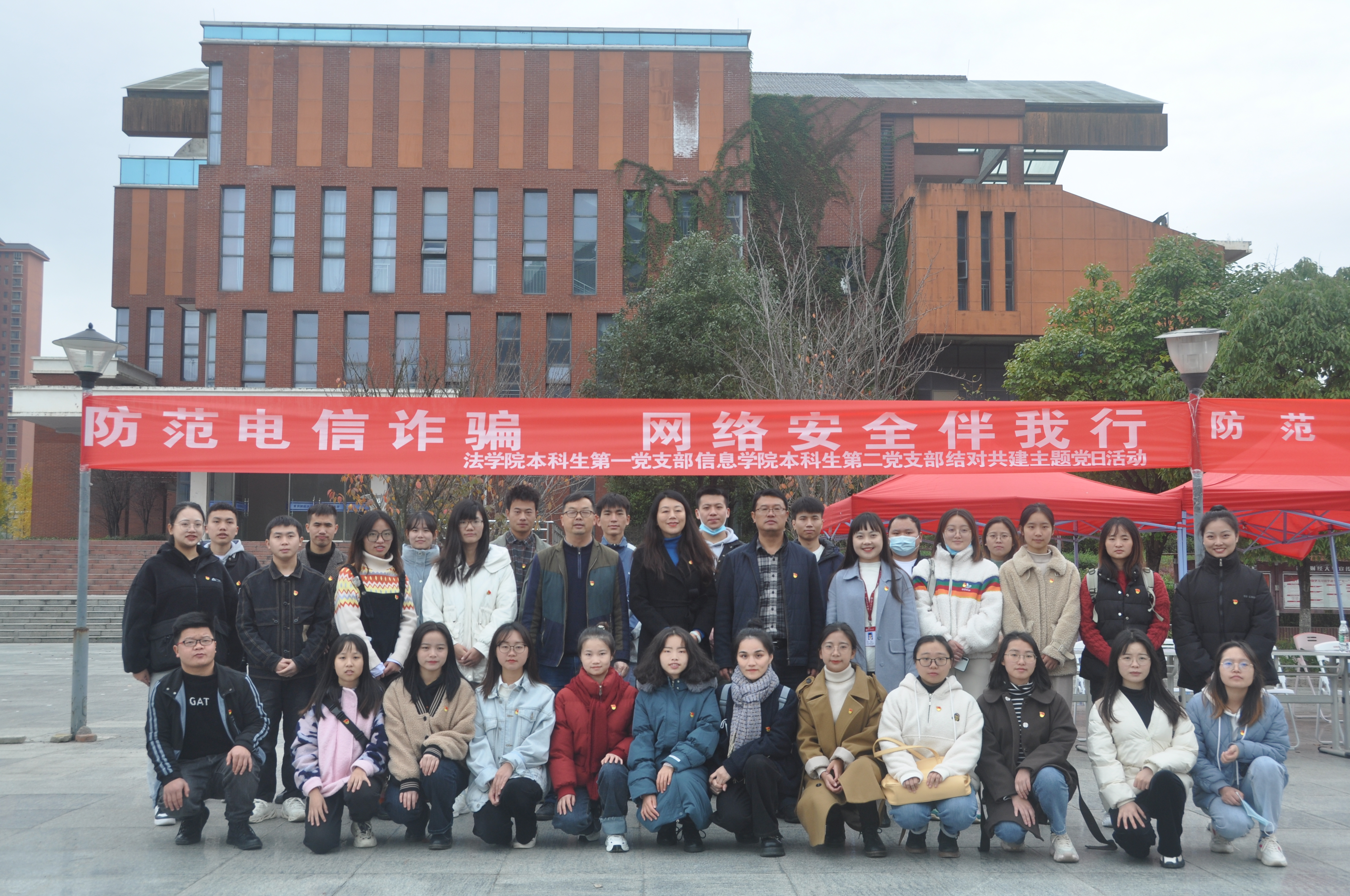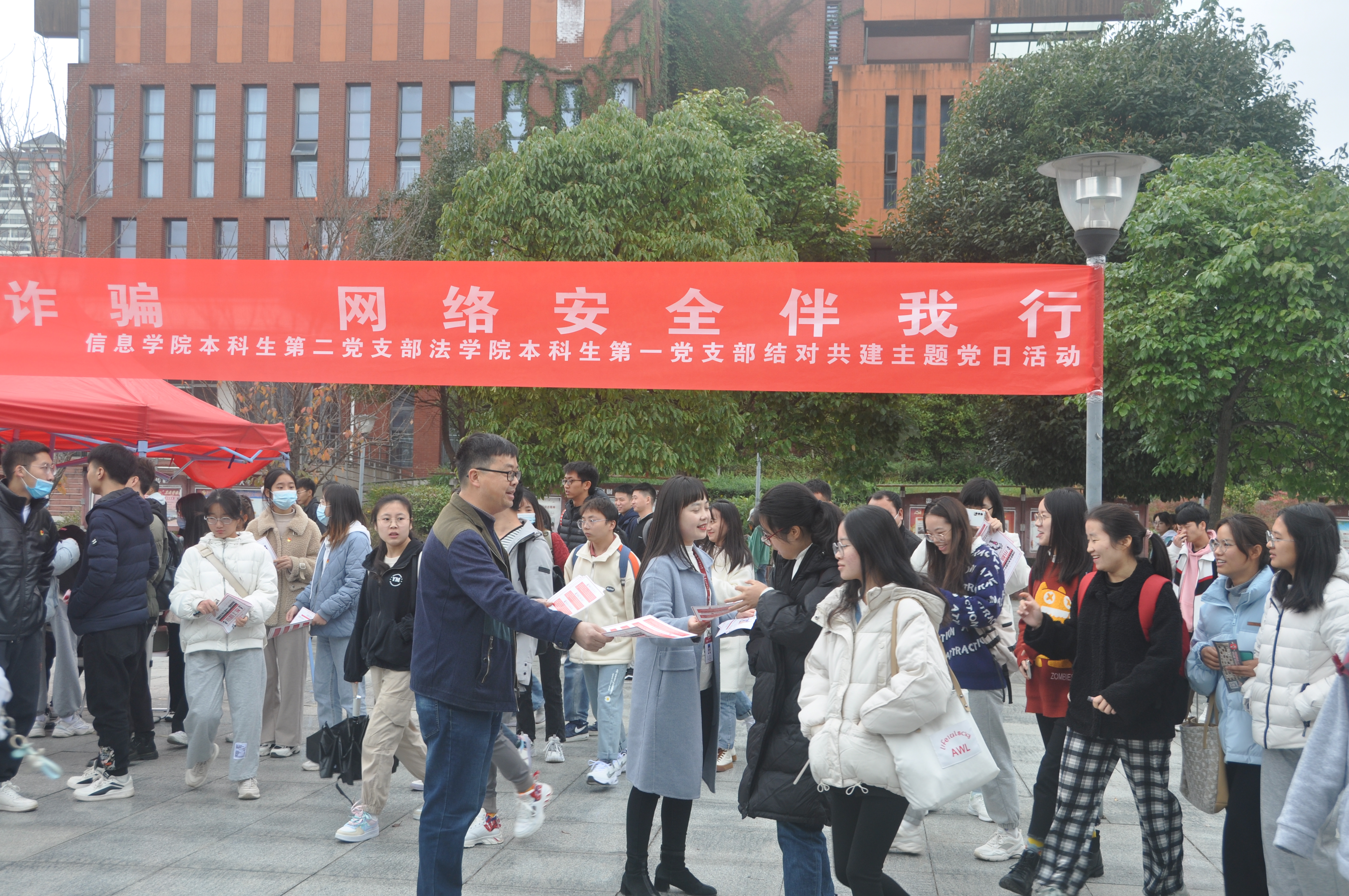 本网讯:(鲍羽 报道|摄影 杨智先)11月11日中午,太阳成集团tyc122cc本科生第二党支部与法学院本科生第一党支部在五四广场开展“防范电信诈骗,网络安全伴我行”结对共建主题党日活动。法公司党委书记詹伟、信息公司党委书记卿春及法学院本科生第一党支部和太阳成集团tyc122cc本科生第二党支部的全体党员参加,太阳成集团tyc122cc本科生第二党支部书记张定义主持活动。