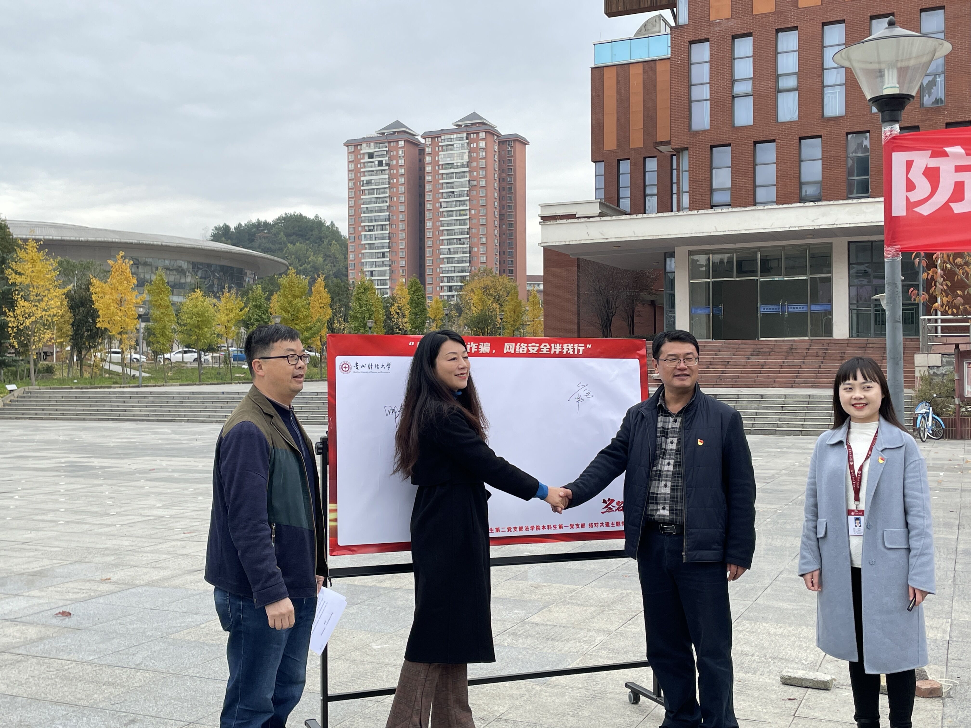 参加活动的全体党员共同为学校师生宣传普及防范电信诈骗要点和网购安全知识,并发放法律知识宣传资料,参与师生积极签名倡议共同防范电信诈骗维护网络安全,活动现场气氛热烈,取得较好效果。