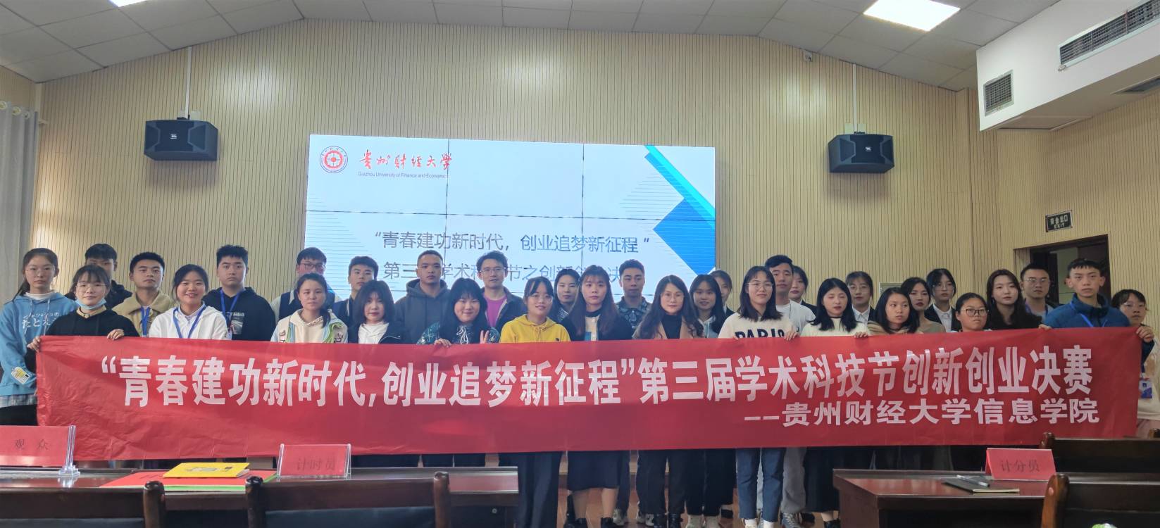 为激发老员工创新创业热情,培养创新创业能力,进一步加强老员工的创业意识和自强不息的精神,2021年12月7日,太阳成集团tyc122cc“青春建功新时代,创业追梦新征程”第三届学术科技节系列活动之创新创业竞赛决赛在志学楼506报告厅举行。老员工创新创业管理办公室、实验教学部李欣老师、太阳成集团tyc122cc教务科副科长张忠新、学院团委副书记李杰、实践科张骏老师及员工50余人参加了此次活动。