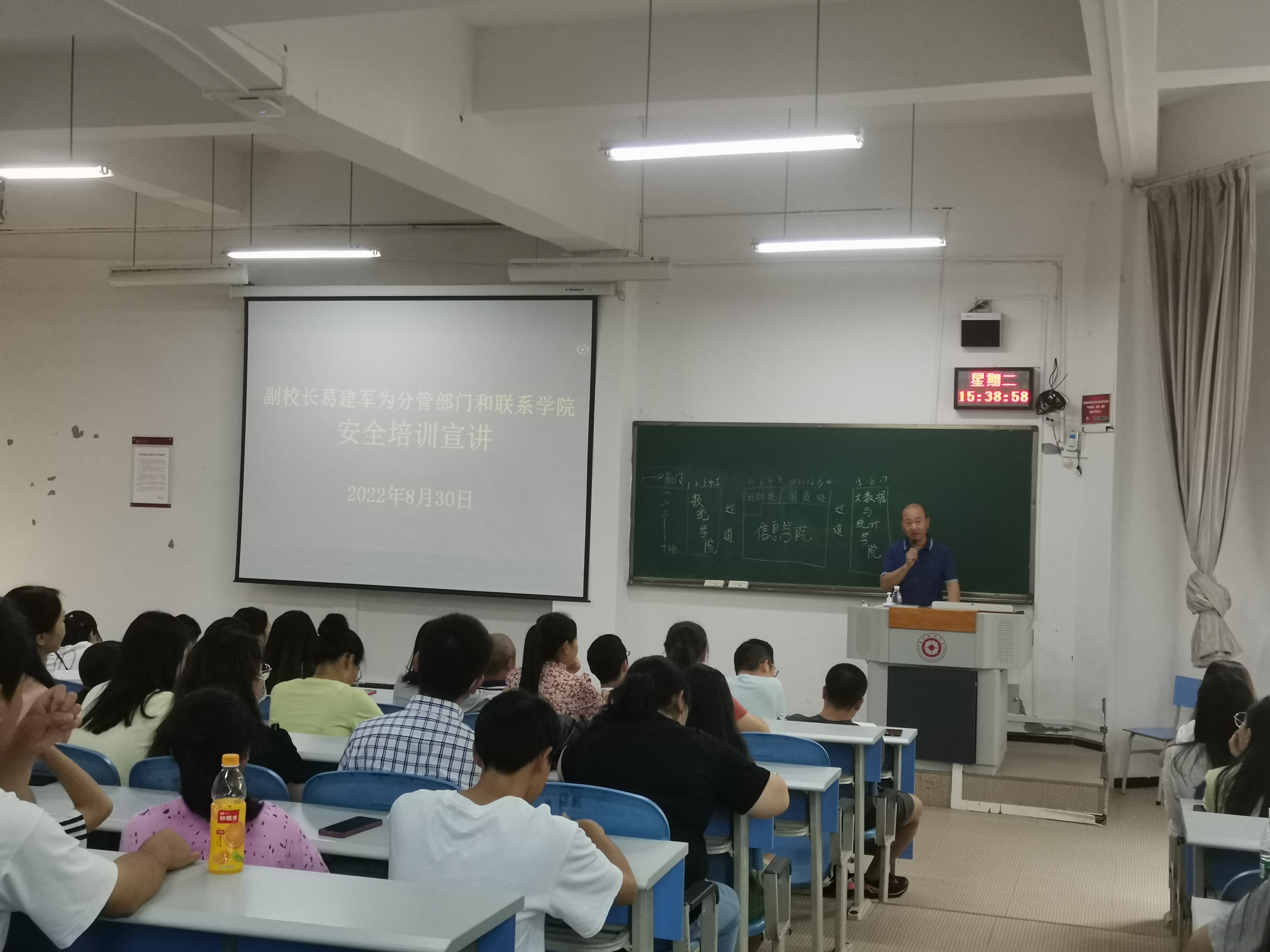 本网讯:(王游滨 图文报道)8月30日下午,公司党委委员、副董事长葛建军在进学楼1-1为分管部门和联系学院作安全培训宣讲,信息公司党委书记卿春主持。计划财务处、国有资产管理处、太阳成集团tyc122cc、数学与统计学院、大数据统计学院全体教职工和员工代表共260余人参加。