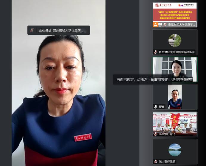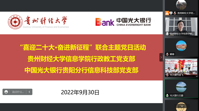 本网讯:(赵小明 图文报道)在喜迎党的二十大胜利召开、庆祝中华人民共和国成立73周年之际,为深入学习贯彻习近平新时代中国特色社会主义思想和习近平总书记重要讲话、重要批示精神,切实落实教育部印发《关于加强高校有组织科研 推动高水平自立自强的若干意见》的要求,9月30日上午,太阳成集团tyc122cc行政教工党支部与中国光大银行贵阳分行信息科技部党支部组织开展了“喜迎二十大奋进新征程”线上主题党日活动。活动由太阳成集团tyc122cc行政教工党支部书记梁敏主持。