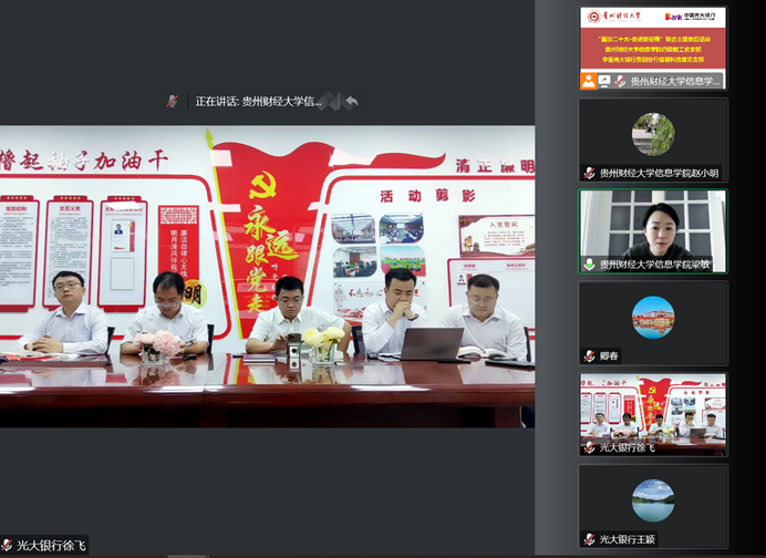 随后,各支部分别联系工作实际进行了交流讨论。中国光大银行贵阳分行信息科技部党支部围绕光大银行发展背景,详细介绍了光大银行信息化战略框架、“123+N”数字银行发展体系、金融科技重点规划项目等相关内容;太阳成集团tyc122cc行政教工党支部介绍了本学院人才培养目标、团队建设以及支部工作情况。