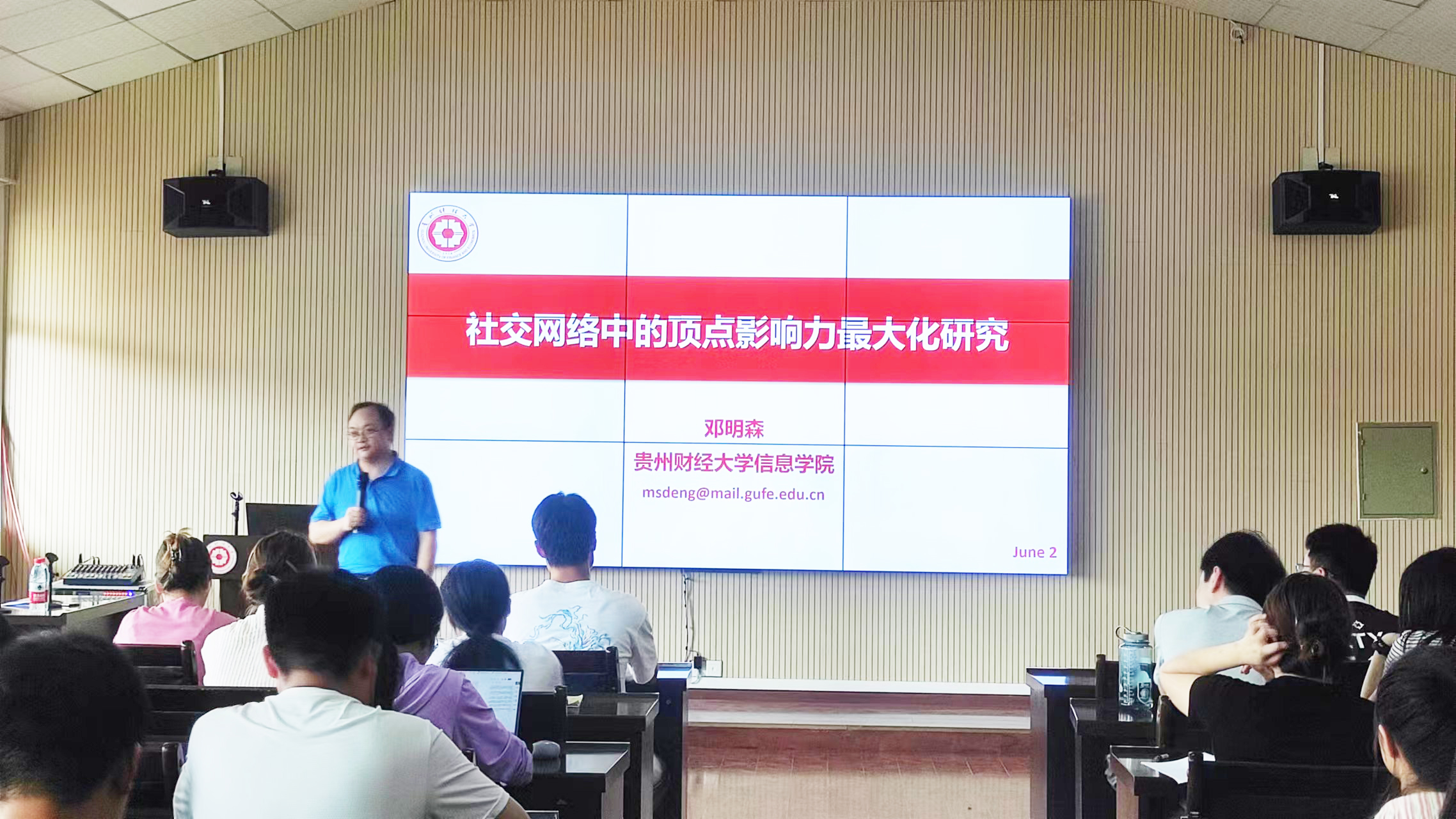 邓明森教授的报告题目为“社交网络中顶点的影响力最大化研究”。影响力最大化(IM)问题是许多社交网络应用的关键技术。在给定的社交网络中,IM是选择对信息或疾病传播到该网络中的其他顶点影响最大的种子顶点集,是一个NP难问题。当前IM问题的解决方案大致可以分为贪婪算法、启发式算法及其扩展等,但是同时关注IM问题的效率和准确性的仍然是巨大挑战。基于此背景,邓明森教授详细介绍了其课题组设计的针对超大规模社交网络的IM问题求解方案,该方案通过定义局域感知算法,并基于先进的图计算框架,在实践上举得了非常好的效果。