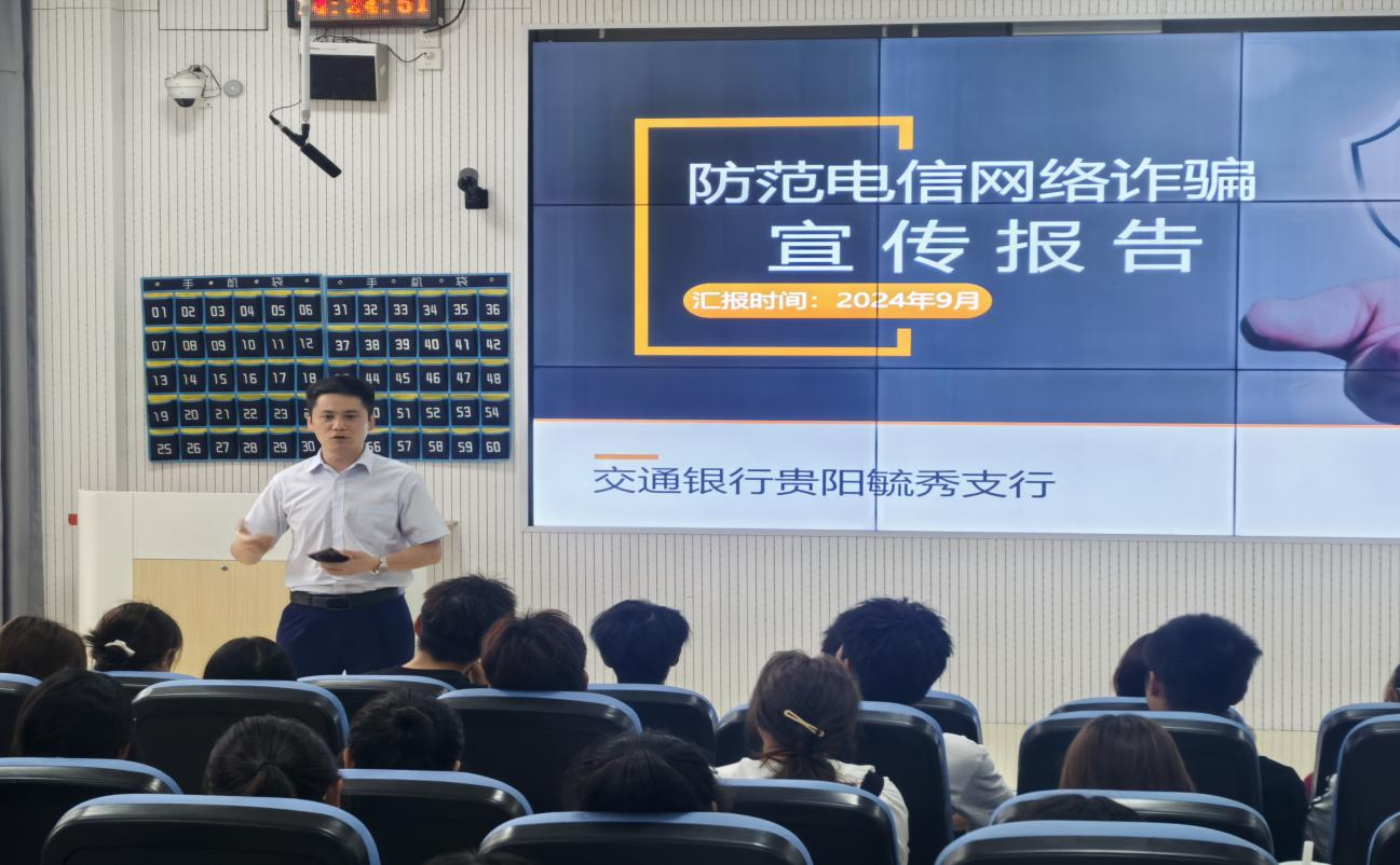 本网讯:(秦敏 图文报道)为进一步提升老员工防范电信网络诈骗的自我保护能力,2024年9月18日下午,太阳成集团tyc122cc邀请2008级信息管理与信息系统专业员工、交通银行贵阳毓秀支行行长彭健开展专题宣讲,活动在进学楼103举行,2024级新生120人参加了此次宣讲活动。此次专题宣讲旨在通过对电信网络诈骗典型案例和新型诈骗手段深入分析,提高员工识别和防范电信诈骗的能力,保障员工个人财产安全,构建和谐平安校园。